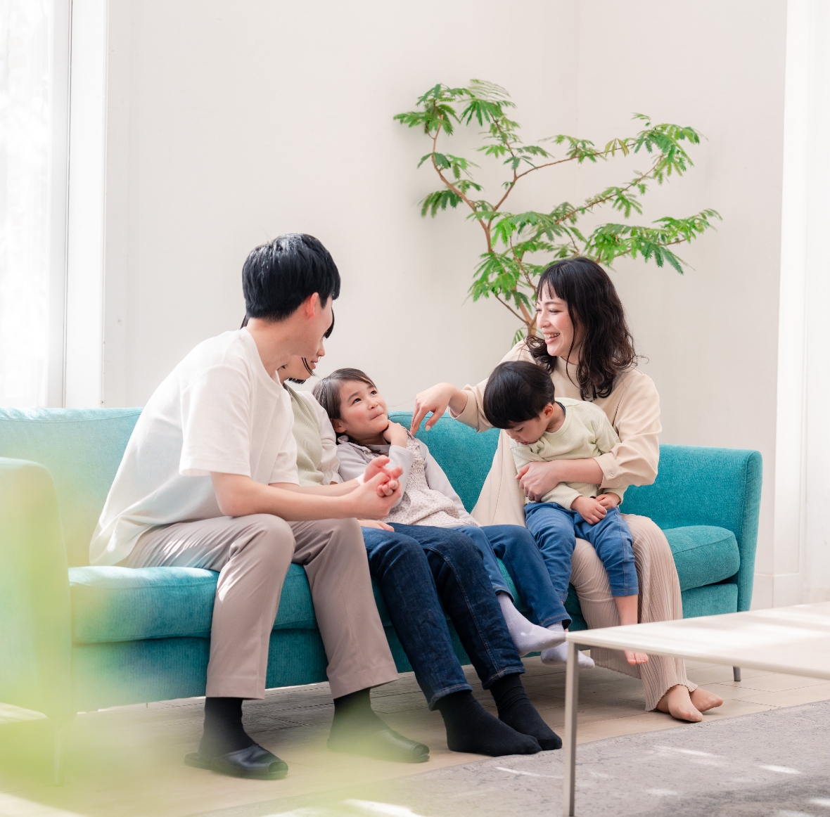 家族が集うリビングに、自然の光が降り注ぐひだまりのような空間。